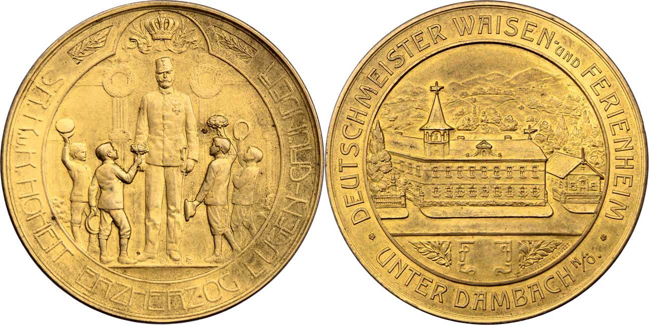 Unter Dambach - řádový útulek pro sirotky b.l. - arciv. vítán chlapci, opis / budovy útulku v horské krajině, opis, Nesign., zlacený bronz 60 mm, patina