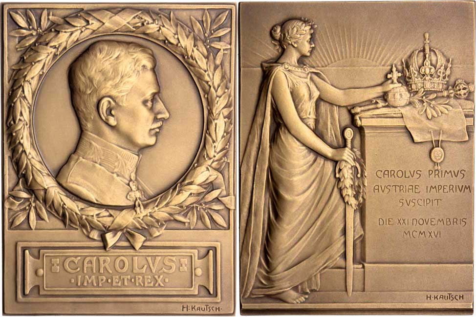 Kautsch - plaketa na převzetí trůnu 21.11.1916 - poprsí císaře zprava ve věnci, nápis/ Austria stojící u oltáře s klenoty, nápis, bronz 55x75 mm, Nov.A.1a