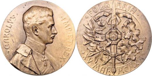 Kautsch - medaile "Folgaria" 1917 - poprsí císaře zprava, opis / meč, dubová a vavřínová ratolest, opis, Sign., patinovaný bronz 65 mm, téměř