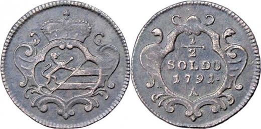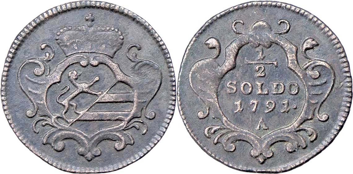 1/2 Soldo 1791 A - pro Gorici a Gradišku, P.34, M-A.294, 1.261g, pěkná patina R!