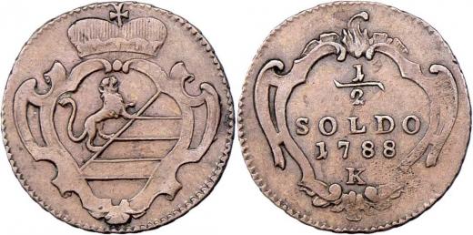 Cu 1/2 Soldo 1788 K - Kremnice pro Gorici a Gradišku, P.62, 1.400g, nep.nedor., pěkná patina, téměř R!