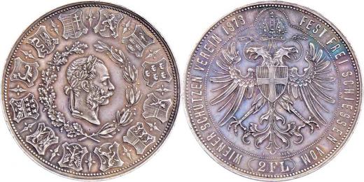 2 Zlatník 1873 - střelby Vídeňského střeleckého spolku - varianta bez tečky za označením nominálu, 22.026g, nep.hr., nep.rysky, krásná patina RR!