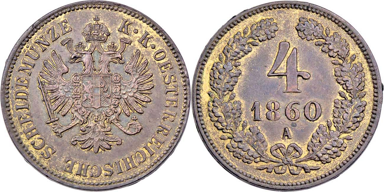 4 Krejcar 1860 A - šroubovací, 8.351g, stopy zlacení, pěkná patina R!