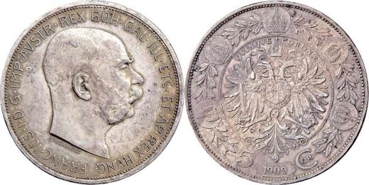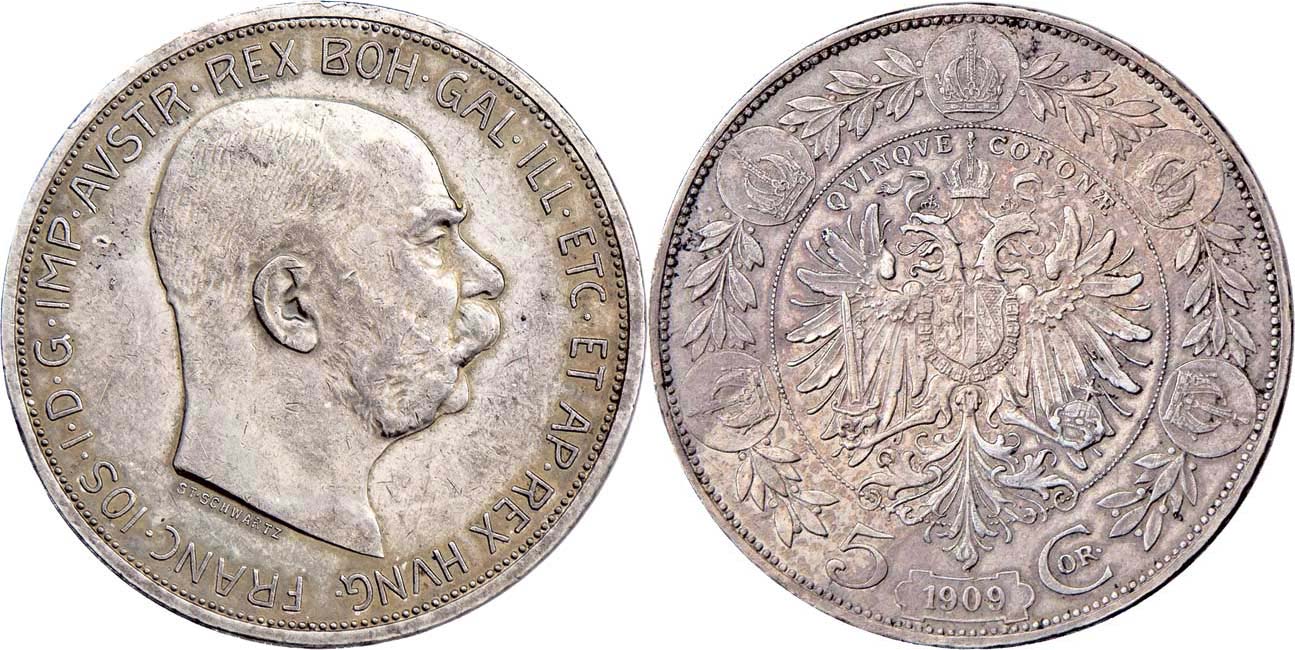 5 Koruna 1909 - Schwartz, 23.969g, nep.hr., dr.rysky, pěkná patina, téměř