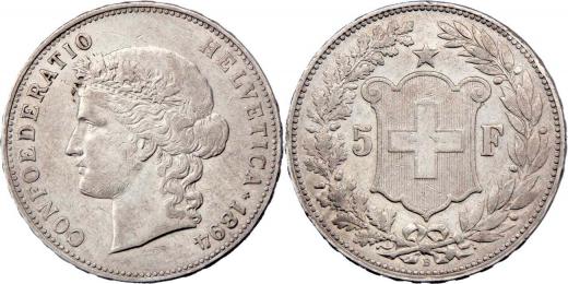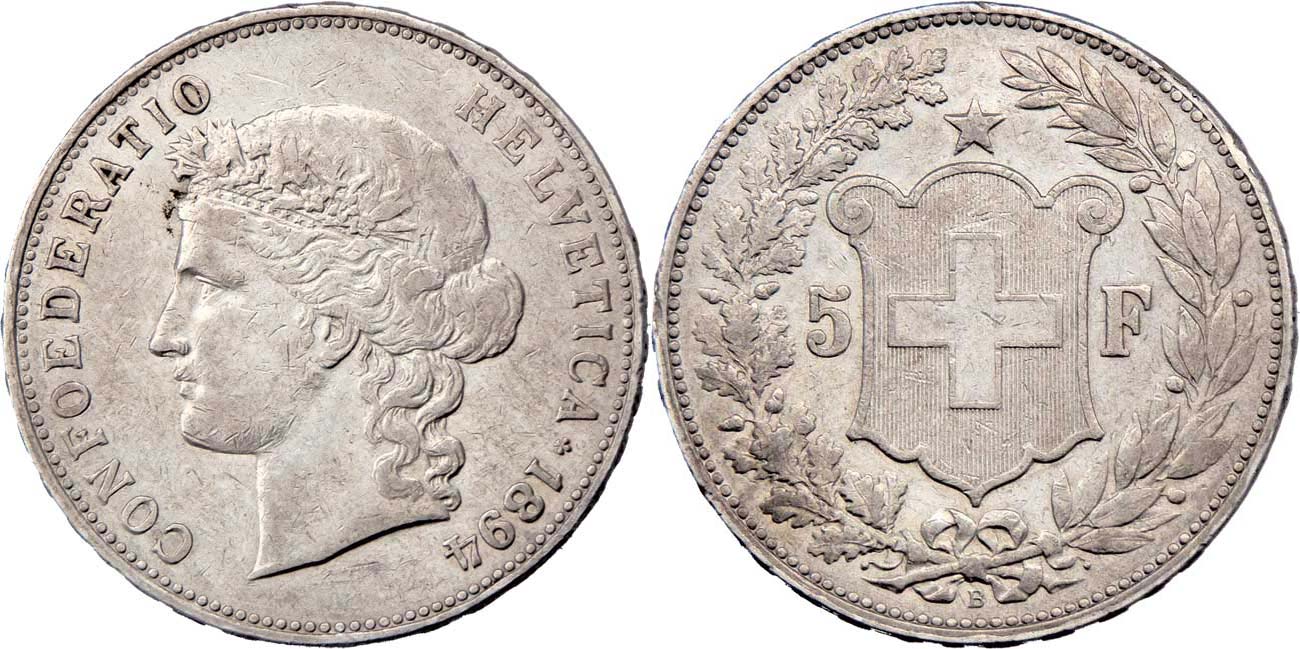 5 Frank 1894 B - hlava Helvetie, KM.34, 24.897g, dr.hr., dr.rysky RR!