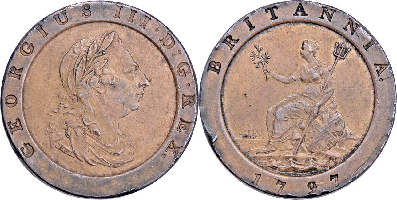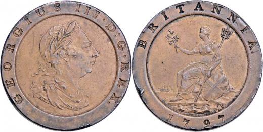 2 Pence 1797 (Cu), KM.619, 56.835g, hrany, nep.rysky, dva nepatrné úhozy, pěkná patina, téměř R!