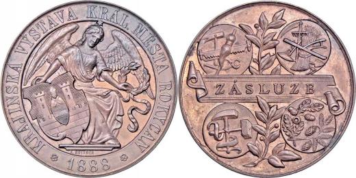 Kettner - Krajinská výstava 1888 - Zásluze - anděl s městským znakem a věncem v rukou, opis / alegorie a nápis na stuze, Sign., bronz 47 mm, patina