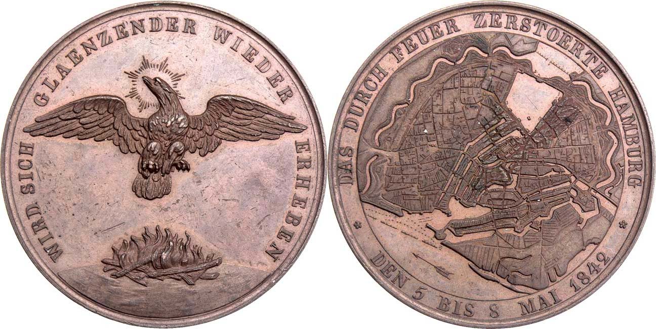 Nesign. - AE medaile na zničující požár 5.-8.V.1842 - plán města, opis / Fénix vylétající z plamenů, opis, 44mm, 41.116g, nep.hr., nep.rysky, pěkná pat., téměř
