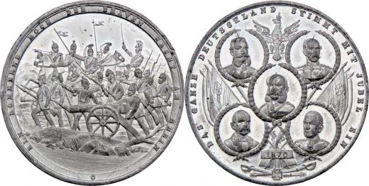 Na paměť války s Francií 1870 - portréty panovníků ve věncích, orlice, zbraně, prapory, opis / vojáci na břehu Rýna, opis, Nesign., cín 53 mm, patina, téměř