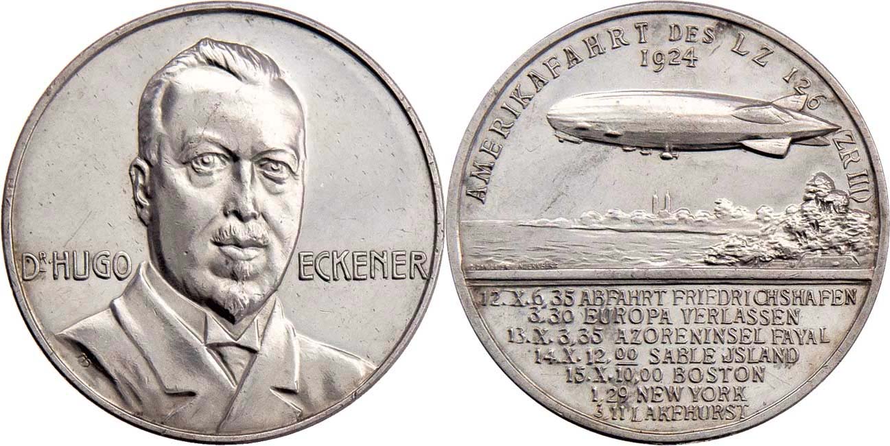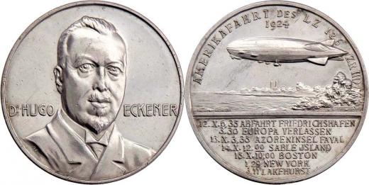 Dr.H.Eckener - let vzducholodi LZ126 do Ameriky 1924 - poprsí zpředu, opis / vzducholoď nad pobřežím, opis a nápis, Sign., Ag990, 33mm, 14.709g, vl.rysky, téměř