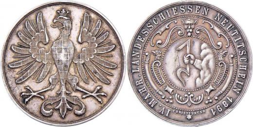 Nový Jičín 1891 - IV. moravské zemské střelby - moravská orlice / znak města v kartuši, německý opis, Sign.Christlbauer, Ag 37mm, 18.467g, dr.hr., dr.škr.