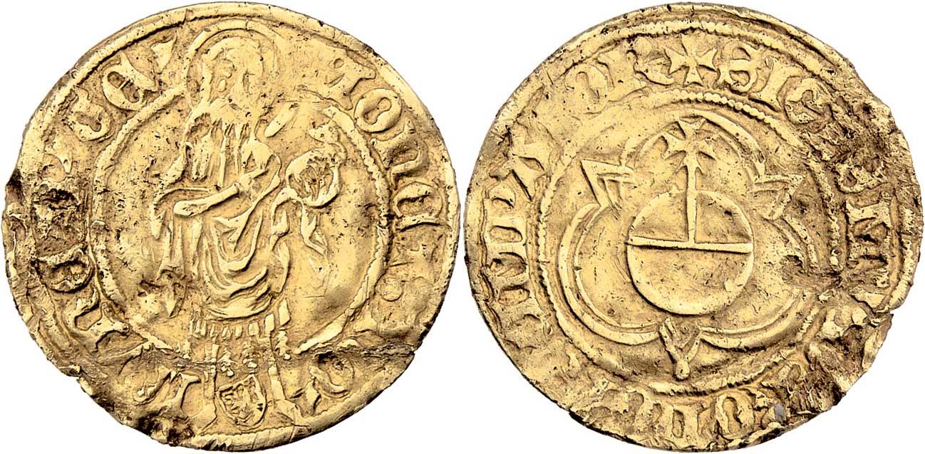 Goldgulden b.l.(1410-1433) - s tit. Zikmunda Lucemb., Fr.1511, 3.401g, zvlněný, nepravidelný okraj, patina