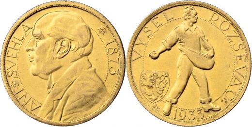 Šejnost - Antonín Švehla na 60.výročí narození 1933 - poprsí zleva, opis / rozsévač zprava, znak, opis, Sign., Punc., Au 987, 20mm, 3.487g, nep.hr.