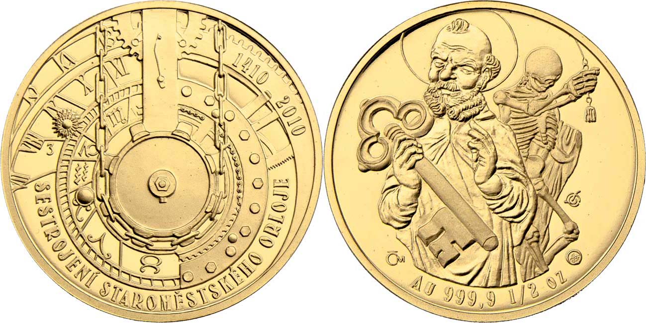 Charvát - 600 let Staroměstského orloje 2010 - část orloje, opis / svatý Petr, smrt, opis, Sign., Punc., Au999, 28mm, 15.579g, kapsle, etue, text