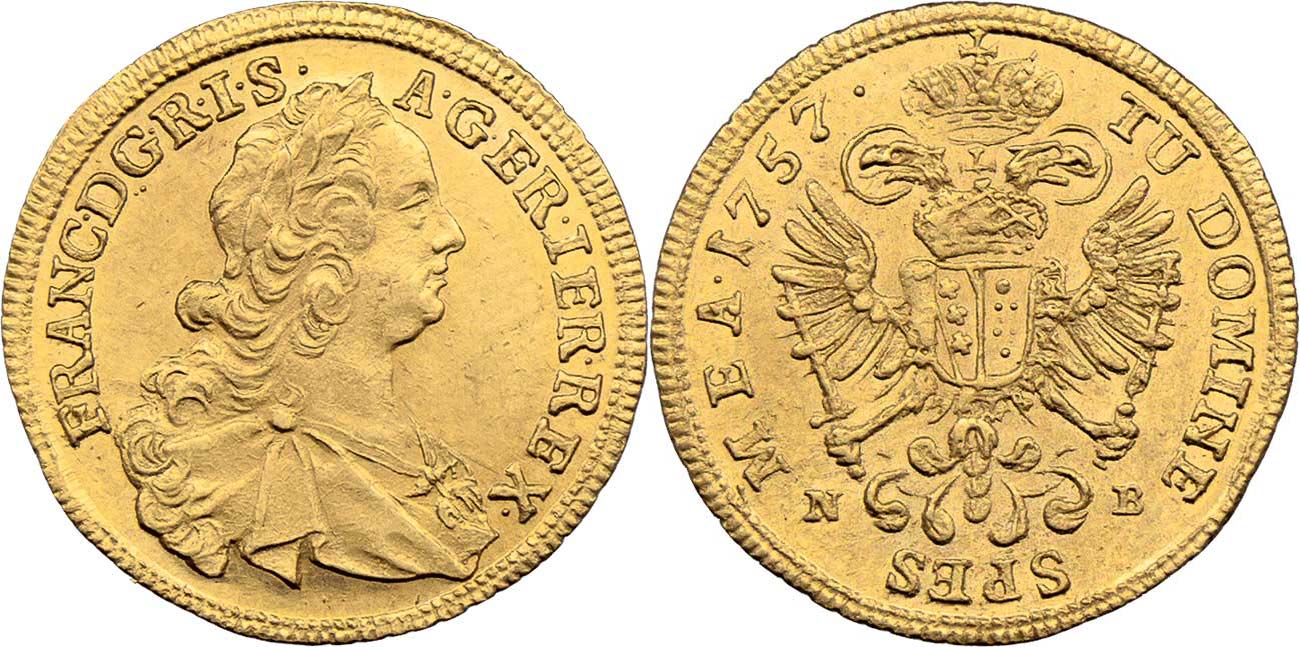 Dukát 1757 N-B, Nagybanya, N.21, Husz.1777A, 3.474g, nep.rysky, pěkná patina, téměř R!
