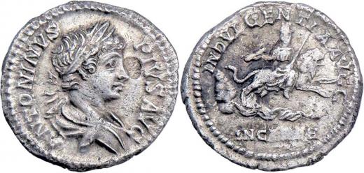 AR Denár, Rv:"INDVLGENTIA.AVGG.IN.CARTH." Indulgentia na lvu zprava, S.1818, RIC.130a - minc. Řím - ražba z let 201 - 206, vada materiálu, pěkná patina