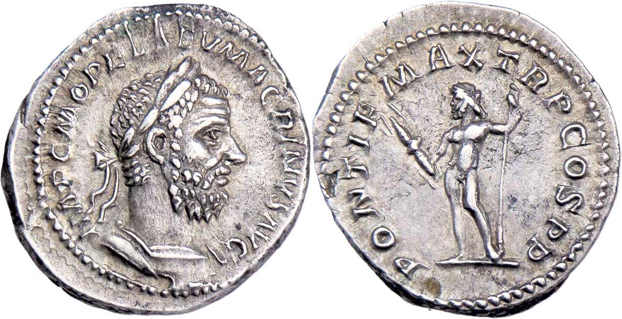 AR Denár, Rv:"PONTIF.MAX.TR.P.COS.P.P." stoj. Jupiter zleva, podobný jako S.1956, RIC.15 - minc.Řím - ražen od dubna do prosince roku 217, mírně exc., patina R!