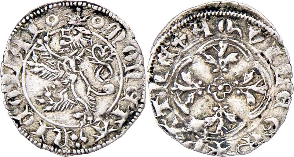 AR Denár b.l., český lev, opis / liliový kříž, opis, De Wit.III.3667, FW.I.2529, 0.842g, mírně exc., pěkná patina R!