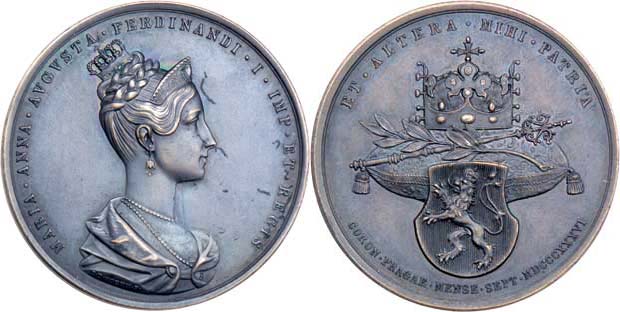 Boehm - AE medaile na korunovaci v Praze 1836 - korunov.portrét zprava, opis / korunovační klenoty na podušce, znak, opis, 47 mm, ČS.1497, P.III/6, pat.