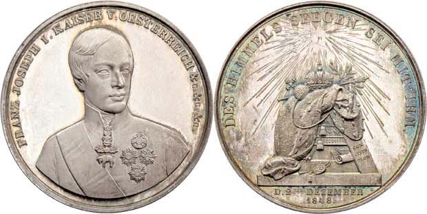 Roth - AR nástupní medaile 2.12.1848 - poprsí zpředu, opis / Boží oko, korunovační insignie na oltáři, opis, Sign.R, 40mm, 28.952g, H.3742, pěkná patina R!