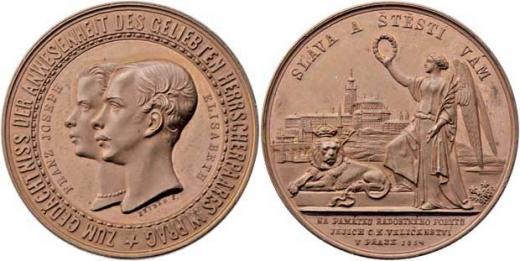 Seidan - na památku radostného pobytu v Praze 1854 - dvojportrét zprava, něm.opis / Niké s věncem, Pražský hrad, český lev, opis a nápis, měď 37mm, krásná pat.