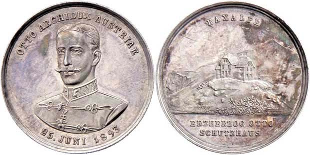 AR menší jeton - horský hotel Raxalpa 25.6.1893 - poprsí mírně zleva, opis / hotel v horách, 3-řádkový nápis, Nesign., Punc., 24mm, 5.172g, pěkná patina