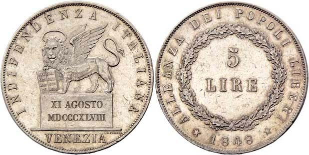 5 Lira 1848 - se lvem svatého Marka na podstavci, Cr.185, 24.855g, dr.hr., dr.rysky, téměř R!