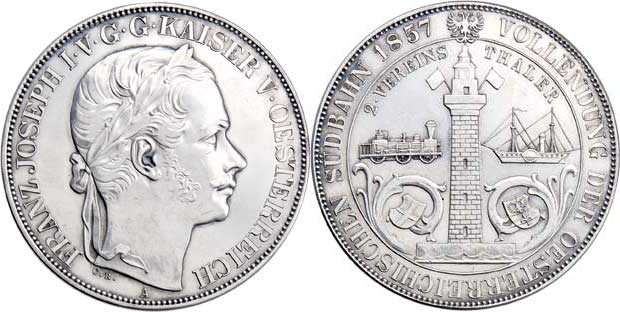 2 Tolar spolkový 1857 A - Jižní dráha - lístky věnce směřují k písmenům "AI" v opisu (celkem raženo pouze 1644 ks obou variant), 37.011g, nep.rysky, téměř RR!
