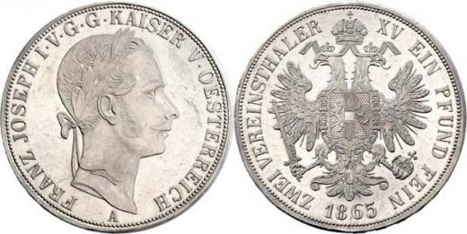 2 Tolar spolkový 1865 A (pouze 7.425ks), 36.986g, dr.hr., dr.rysky, téměř RR!