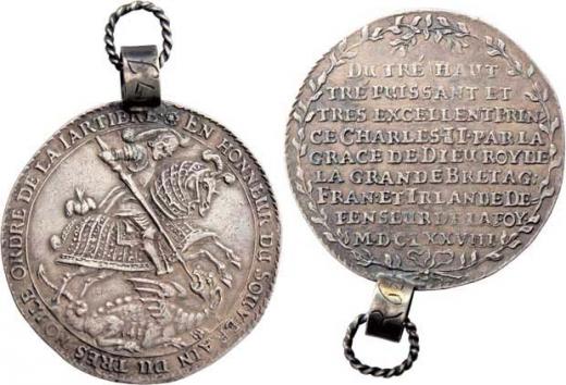 Tolar na podívanou 1678 - se svatým Jiřím (na udělení Podvazkového řádu), jako Haupt.32/261, Dav.7633, ale pouze 25.279g včetně ouška s rytým letopočtem 1762 R!