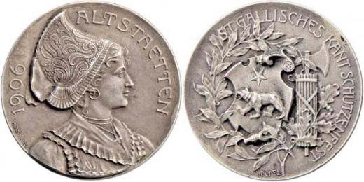 Altstaetten 1906 - střelby kantonu St.Gallen - hlava ženy v klobouku, opis / znak kantonu, vavříny, opis, Sign.Holy F., patinované Ag, 23mm, 6.455g, téměř