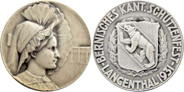 Bern - Langenthal 1931 - střelby kantonu - hlava ženy v klobouku zprava / znak kantonu, vavříny, opis, Sign.Huguenin, patinované Ag 900, 33mm, 16.575g, tém.