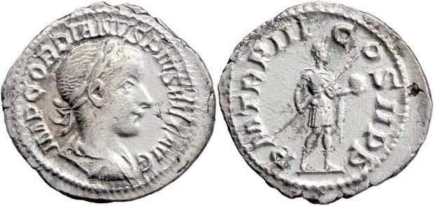 AR Denár, Rv:"P.M.TR.P.III.COS.II.P.P.", stoj. císař s kopím a globem, S.2374, RIC.115 - minc. Řím - ražba z let 241 - 243, pěkná patina RR!