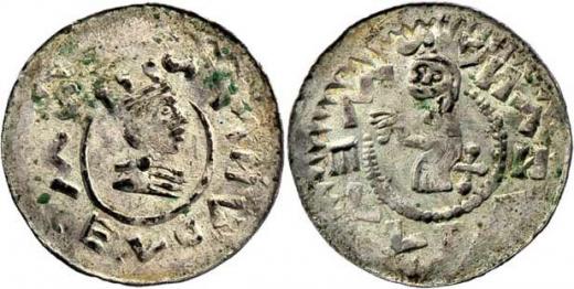 Denár, Ca.342a, F.VIII/27 (863), V-P.48v, 0.626g - za postavou sv. Václava křížek, nep.nedor., patina