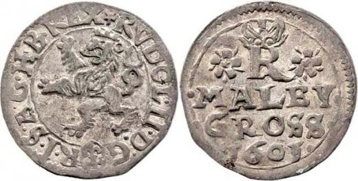 Malý groš 1601, Jáchymov-Taubenreutter, HN.9 (7c), nápis ". MALEY ./. GROSS ./. 1601 .", 0.972g, nep.nedor.