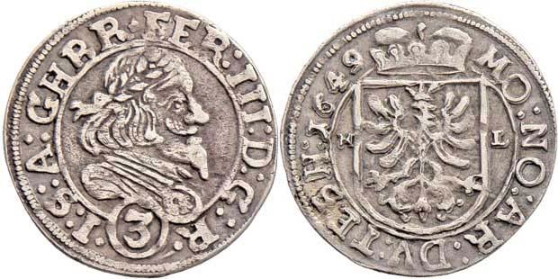 3 Krejcar 1649 HL, Těšín a Skočov - Loss a Bremen, MKČ.1350, Kop.5697 (Kop. řadí mezi ražby Alžběty Lukrecie), 1.532g, nep.nedor., nep.dvojráz, patina R!