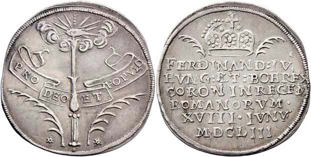 Velký jeton na korunovaci v Regensburgu 18.VI.1653 - Boží oko, žezlo, palmové ratolesti a nápis na stuze / koruna a nápis, M.844, Nov.7b, 3.192g, nep.rys., pat.