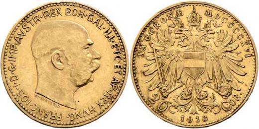 20 Koruna 1916 - nový znak (pouze 72.000 ks), 6.778g, nep.hr., nep.rysky, patina, téměř RR!