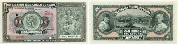 100 Koruna 1920, série D - anulát "000000" - 2x přet. červeně "SPECIMEN", 1x otvor 3.5mm, BHK.16s, Kar.10z