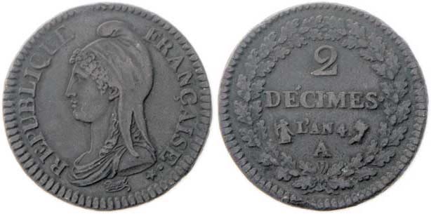 2 Decimes, rok 4 (= 1795) A, Paříž, KM.638.1, 19.148g, nep.vady materiálu, dr.hr., dr.rysky, pěkná patina R!