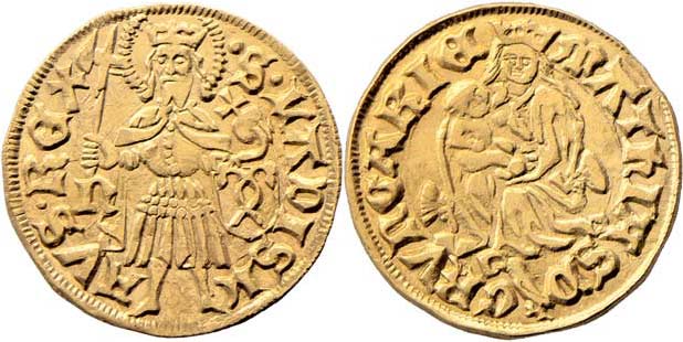 Dukát (1483-1485) n-"štít", Nagybanya-neobsazeno, Madona, hvěty bodláku, opis / svatý Ladislav, opis, Len.45/7-9, Husz.680, Fr.22a, 3.481g, nep.nedor.