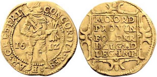 Dukát 1612 - Frísko, KM.13, Fr.223, bez značky lva na konci líc. opisu, 3.460g, mírně zvlněný, nep.škr., pěkná patina