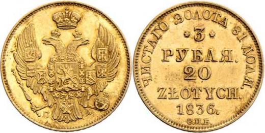 20 Zlotých (3 Rubly) 1836 SPB/PD, Petrohrad, Cr.136.2 (pouze 10.000 ks), Fr.111, 3.879g, nep.hr., nep.rys., pěkná patina, téměř RR!