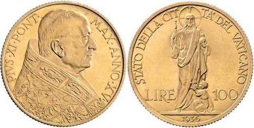 100 Lira 1936 - XV.rok pontifikátu, Y.10 (raženo pouze 8239 ks), 5.192g, nep.rysky R!