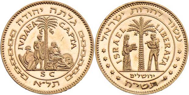 Svobodný Israel 1958 - zajatci pod palmou (replika římské mince), opis / svobodní lidé pod palmou, opis, Nesign., Nepunc., Au27mm, 14.966g, nep.hr., nep.rysky