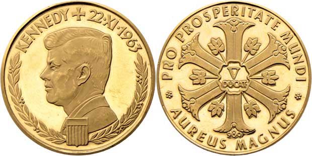 J.F.Kennedy - 5-dukátová úmrtní medaile 22.XI.1963 - hlava zleva, znak, věnec a opis / emblém s označením nominálu, Nesign., Au980, 35mm, 17.398g, nep.rysky