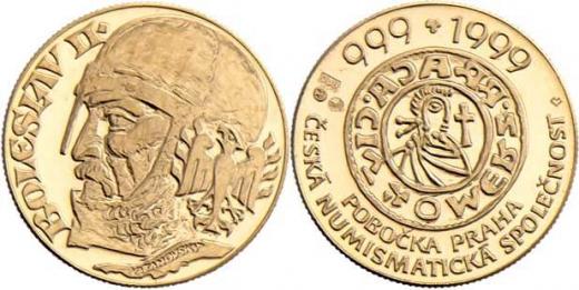 Vitanovský - 1000 let úmrtí Boleslava II. 1999 - hlava v přilbě zleva, orlice, opis / replika denáru, opisy, Sign., Au986, 20mm, 3.563g, pouze 75ks RR!