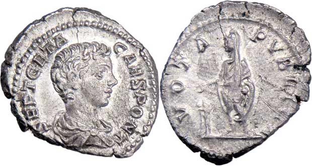 AR Denár, Rv:"VOTA.PVBLICA." Geta u oltáře, RIC.24, podobný jako S.1923 - mincovna Řím - ražba z let 200 - 202, nepravidelný tvar střížku, pěkná patina