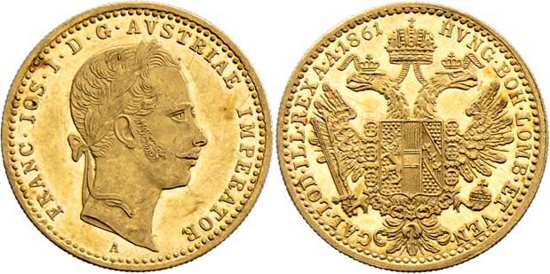 Dukát 1861 A, 3.498g, nep.rysky, patina, téměř