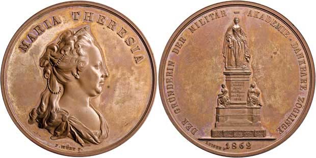 Würt a Leisek - 100 let vojenské akademie 1862 - portrét, opis / pomník císařovny ve Vídeňském Novém Městě, opis, Sign., bronz 60mm, H.7151, patina, etue